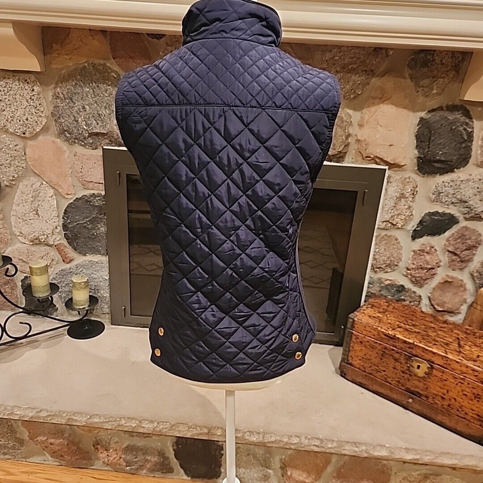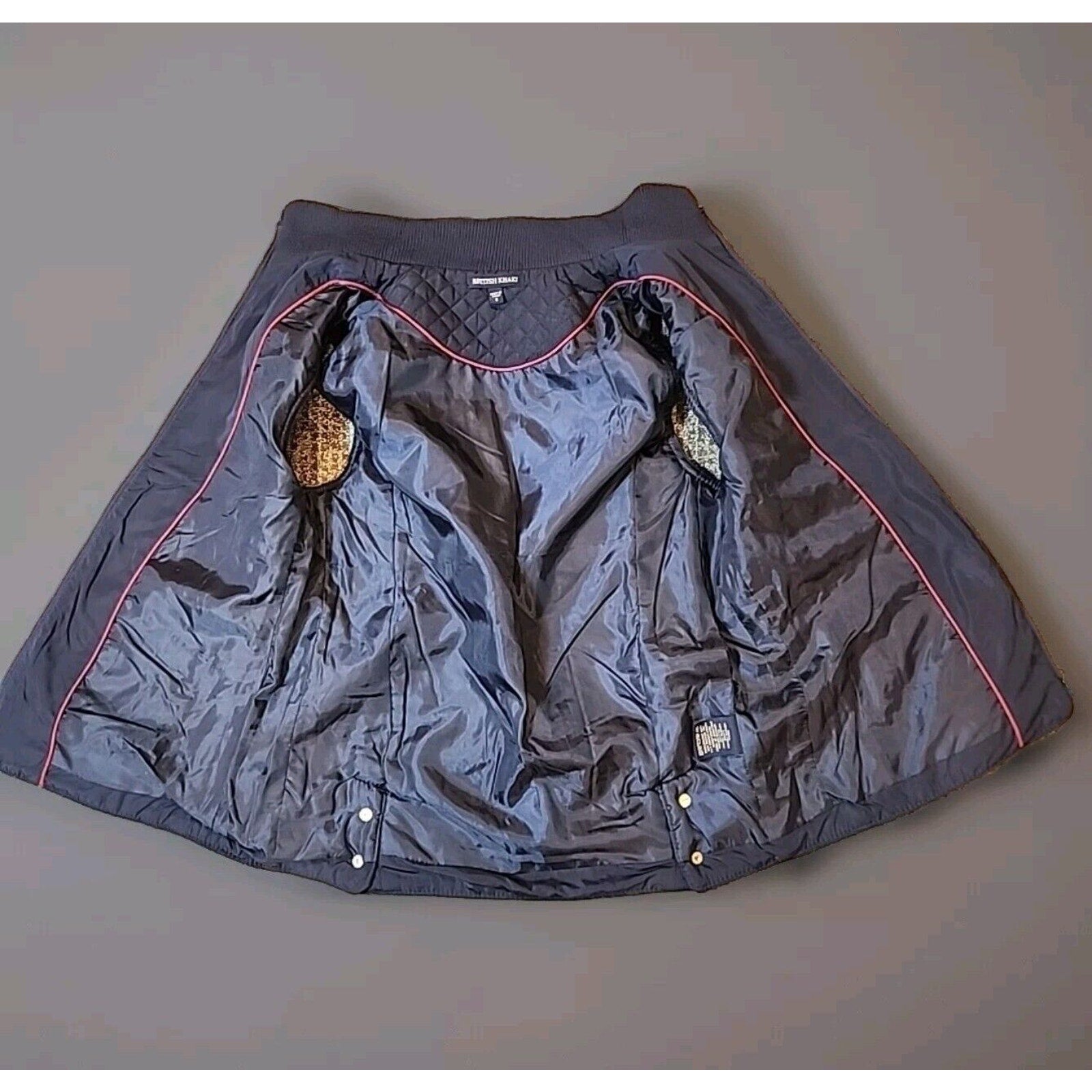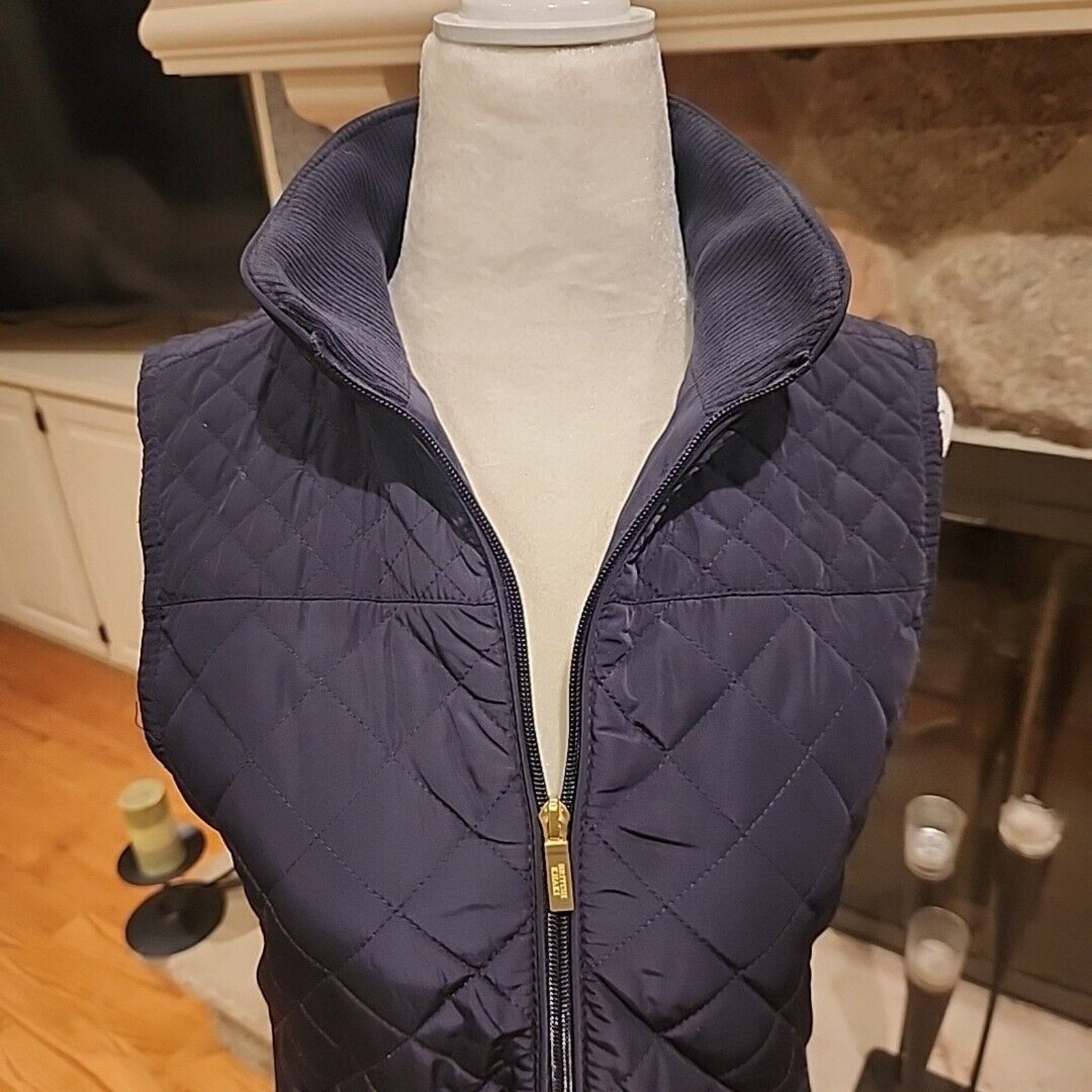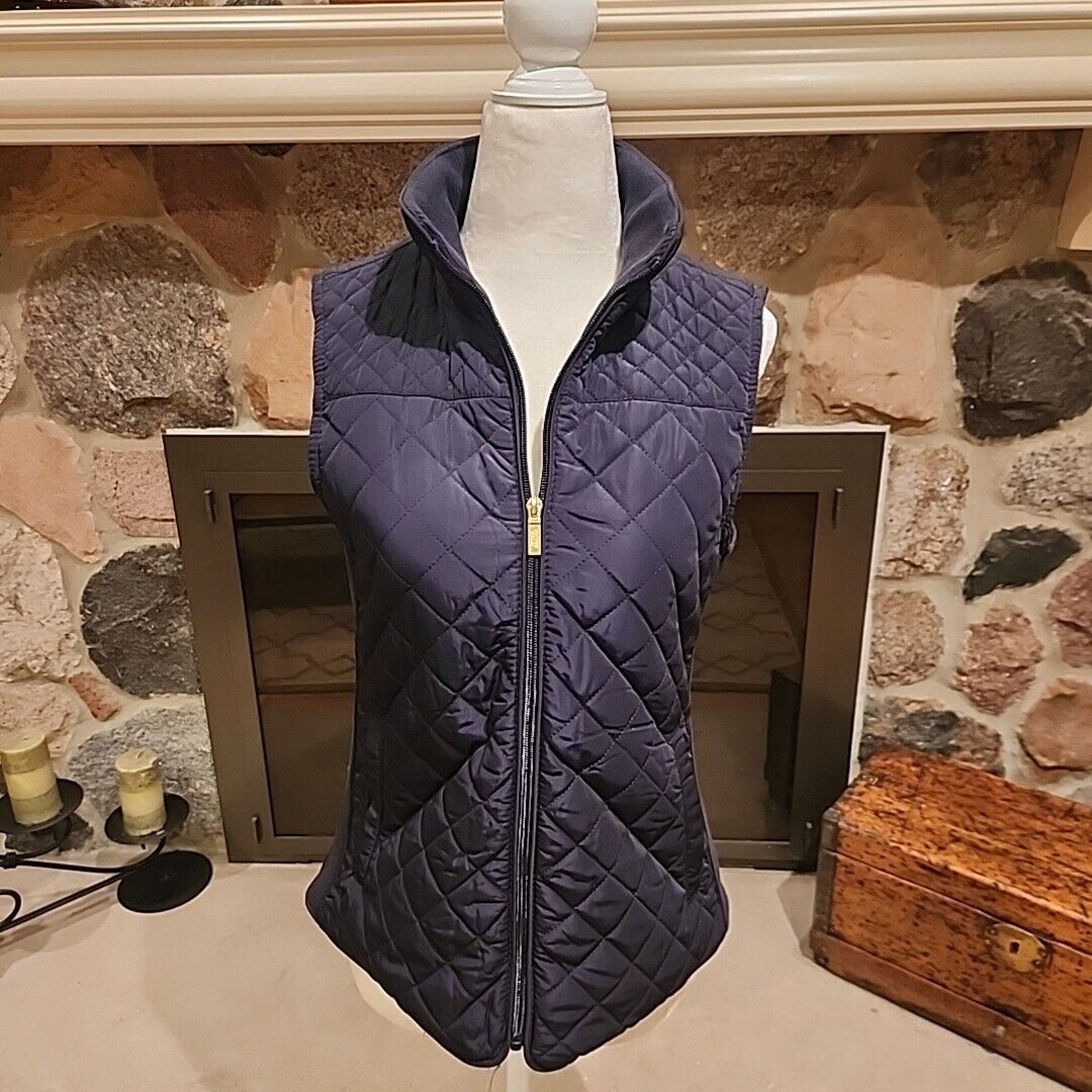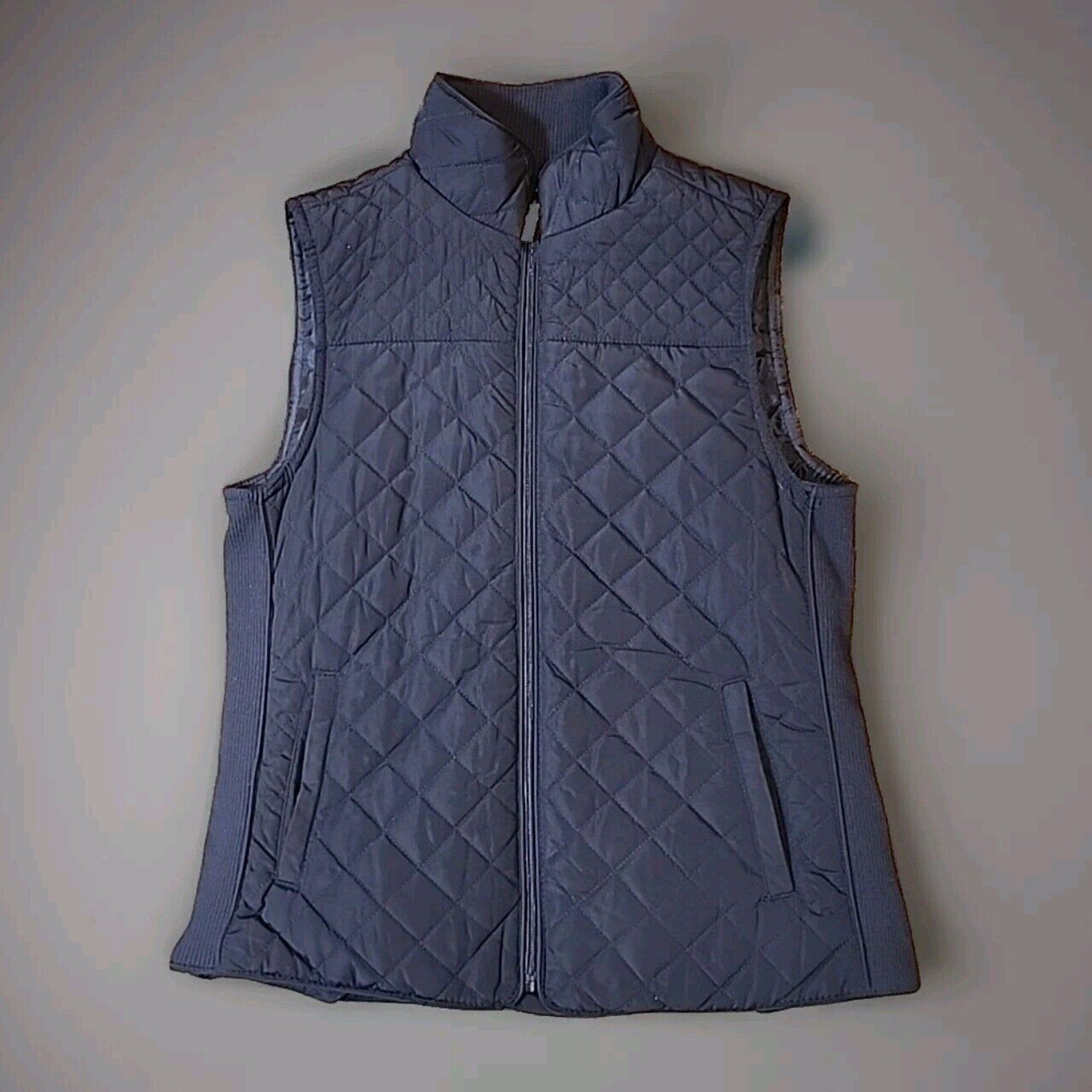 British Khaki Womens Quilted Vest Full Zip Small Blue Knit Insets Lined Pockets